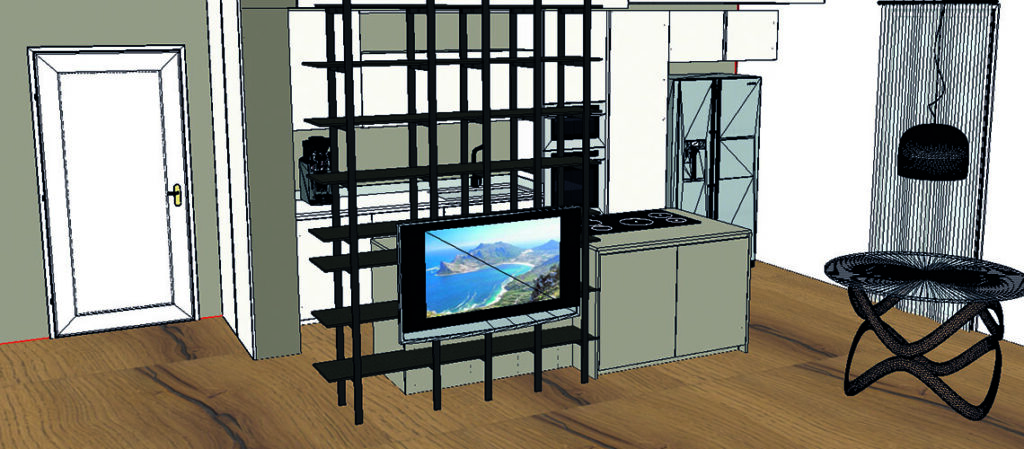 È stata pensata lineare, con un’isola centrale collegata ad un totem libreria che permettesse di dividere la stanza e posizionar il televisore in maniera “strategica”…